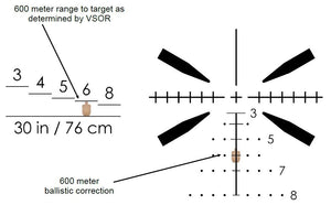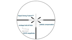The sight incorporates an LED for reticle illumination under low light conditions. The reticle consists of a cross hair with Rapid Aiming Feature™, ballistic compensation, and auxiliary stadia lines and dots to assist in shooting at various ranges. The vertical Subtention Optical Rangefinder (VSOR) allows the user to accurately estimate range