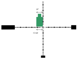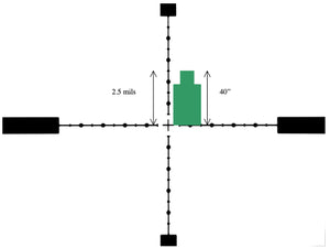 The Gen 2 mildot reticle can be used in many ways but like many things it requires practice to become truly proficient at using it. Nothing can be truer when using the reticle to range the distance to a target, an application the reticle is often used for. To accomplish this task the size of the object must be known first, as this will greatly aid in getting an accurate range estimate. Below we will go through how to range a target that is 40” tall and 19” wide.